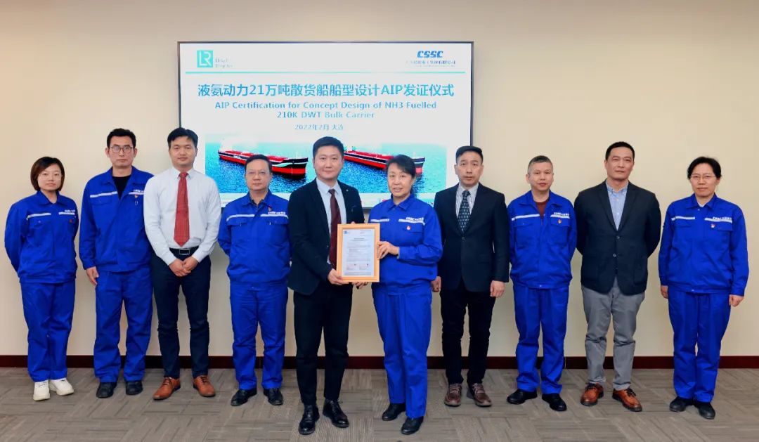 2月25日,中國(guó)船舶集團(tuán)旗下大船集團(tuán)最新研發(fā)的液氨動(dòng)力21萬噸散貨船設(shè)計(jì)方案,獲英國(guó)勞氏船級(jí)社(LR)原則性認(rèn)可(AIP)證書。