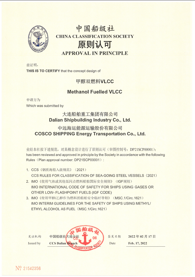甲醇燃料VLCC分別獲得DNV、CCS船級(jí)社AIP認(rèn)可。