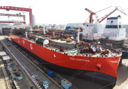 2月15日,在4號塢率先出塢的是江南造船為廣東九豐能源集團(tuán)有限公司建造的國內(nèi)首制79800立方米Mark III型薄膜式液化天然氣(LNG)運(yùn)輸船,以及為天津西南海運(yùn)有限公司建造的93000立方米超大型液化氣船(VLGC)首制船;同時(shí)起浮的還有93000立方米VLGC后續(xù)半船和即將移位至3號塢的24100TEU超大型集裝箱船的艏部巨型環(huán)段。同批次的后續(xù)作業(yè)將轉(zhuǎn)移到3號塢,預(yù)計(jì)在2月24日,江南造船為地中海航運(yùn)(MSC)建造的24100TEU超大型集裝箱船系列第二艘(H2733船)以及為新加坡Petredec公司建造的93000立方米VLGC系列第二艘(H2736船)出塢,后續(xù)兩艘半船同步起浮。