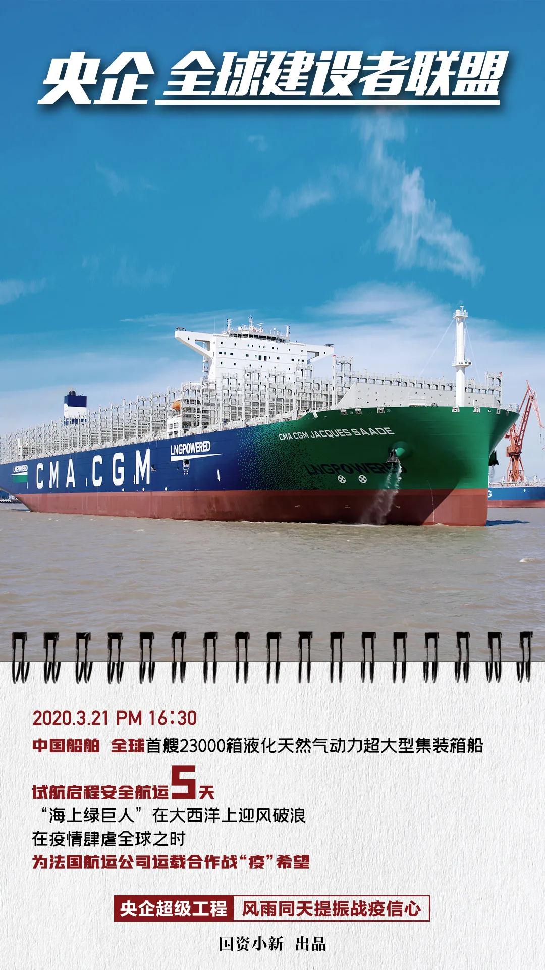 ????今天,國資小新發(fā)布圖文消息《央企全球建設(shè)者聯(lián)盟:風(fēng)雨同天提振國際合作戰(zhàn)疫信心!》。開篇提到中國船舶集團所屬滬東中華建造的全球首艘23000箱液化天然氣(LNG)動力集裝箱船開啟常規(guī)試航之旅,在疫情肆虐全球之時,為法國航運公司運載合作戰(zhàn)“疫”希望。
