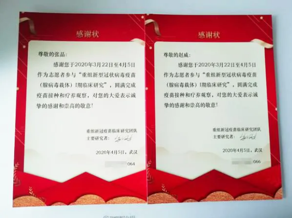 △ 新冠疫苗臨床研究團(tuán)隊(duì)給張晶夫婦頒發(fā)的“感謝狀”