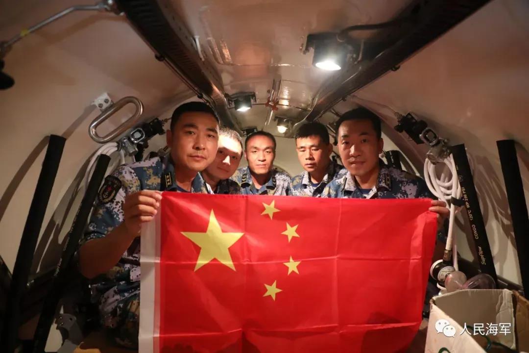 經過2個小時的緊張下潛,深潛救生艇終于到達,并突破指定極限下潛深度,官兵們展開五星紅旗驕傲地宣布“我的戰(zhàn)位在海底531.1米。