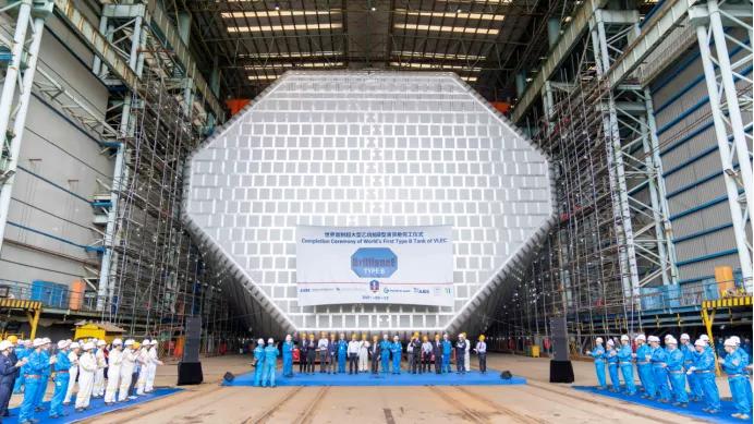 VLEC建造團隊在船東、配套廠商和船級社等各方密切配合下,共同克服新冠肺炎疫情等不利因素,攻克B型液貨艙核心關鍵技術難點,注重項目管理導向、革新工藝工法、鎳鋼焊接程序、薄板變形控制和優(yōu)化建造流程。從2019年12月底合同簽約到今天首制船的完工交付,總建造周期24個月,碼頭舾裝周期4個月,均開創(chuàng)了江南造船大型液化氣船首制船最短周期紀錄,實現(xiàn)了復雜船型節(jié)拍化建造。