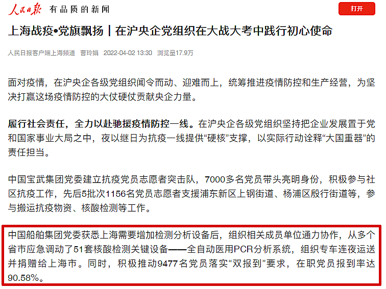 “中國船舶集團(tuán)黨組獲悉上海需要增加檢測分析設(shè)備后,組織相關(guān)成員單位通力協(xié)作,從多個省市應(yīng)急調(diào)動了51套核酸檢測關(guān)鍵設(shè)備——全自動醫(yī)用PCR分析系統(tǒng),組織專車連夜運(yùn)送并捐贈給上海市。同時,積極推動9477名黨員落實(shí)‘雙報到’要求,在職黨員報到率達(dá)90.58%。”