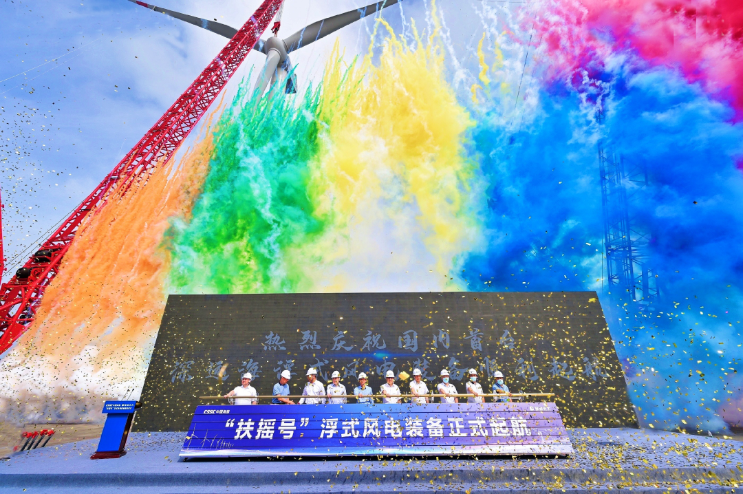 5月29日,中國船舶集團(tuán)旗下中國海裝牽頭研制的國內(nèi)首臺深遠(yuǎn)海浮式風(fēng)電裝備——“扶搖號”從廣東茂名碼頭起航,前往平均水深65米的廣東湛江附近海域投入示范應(yīng)用。
