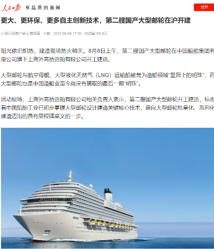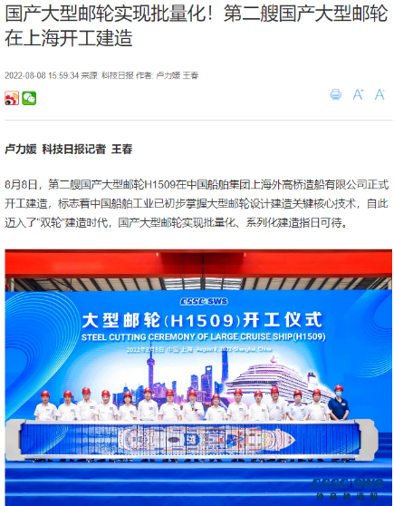8月8日,第二艘國(guó)產(chǎn)大型郵輪在中國(guó)船舶集團(tuán)旗下外高橋造船開建,這標(biāo)志著中國(guó)船舶工業(yè)已初步掌握大型郵輪設(shè)計(jì)建造關(guān)鍵核心技術(shù)。