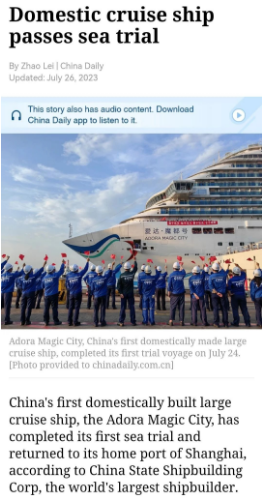 7月24日晚,首艘國產(chǎn)大型郵輪“愛達(dá)·魔都號”完成第一次試航所有試驗(yàn)項(xiàng)目比原計劃提前一天凱旋,人民日報、新華社、中央電視臺等中央主流媒體進(jìn)行了報道。