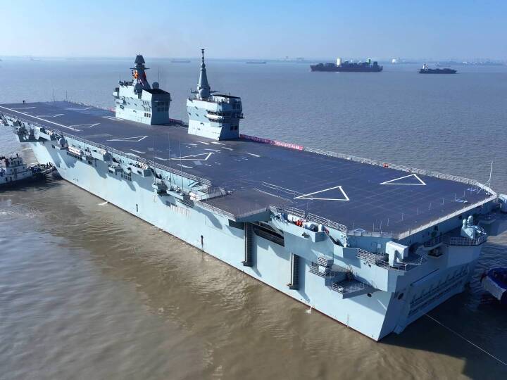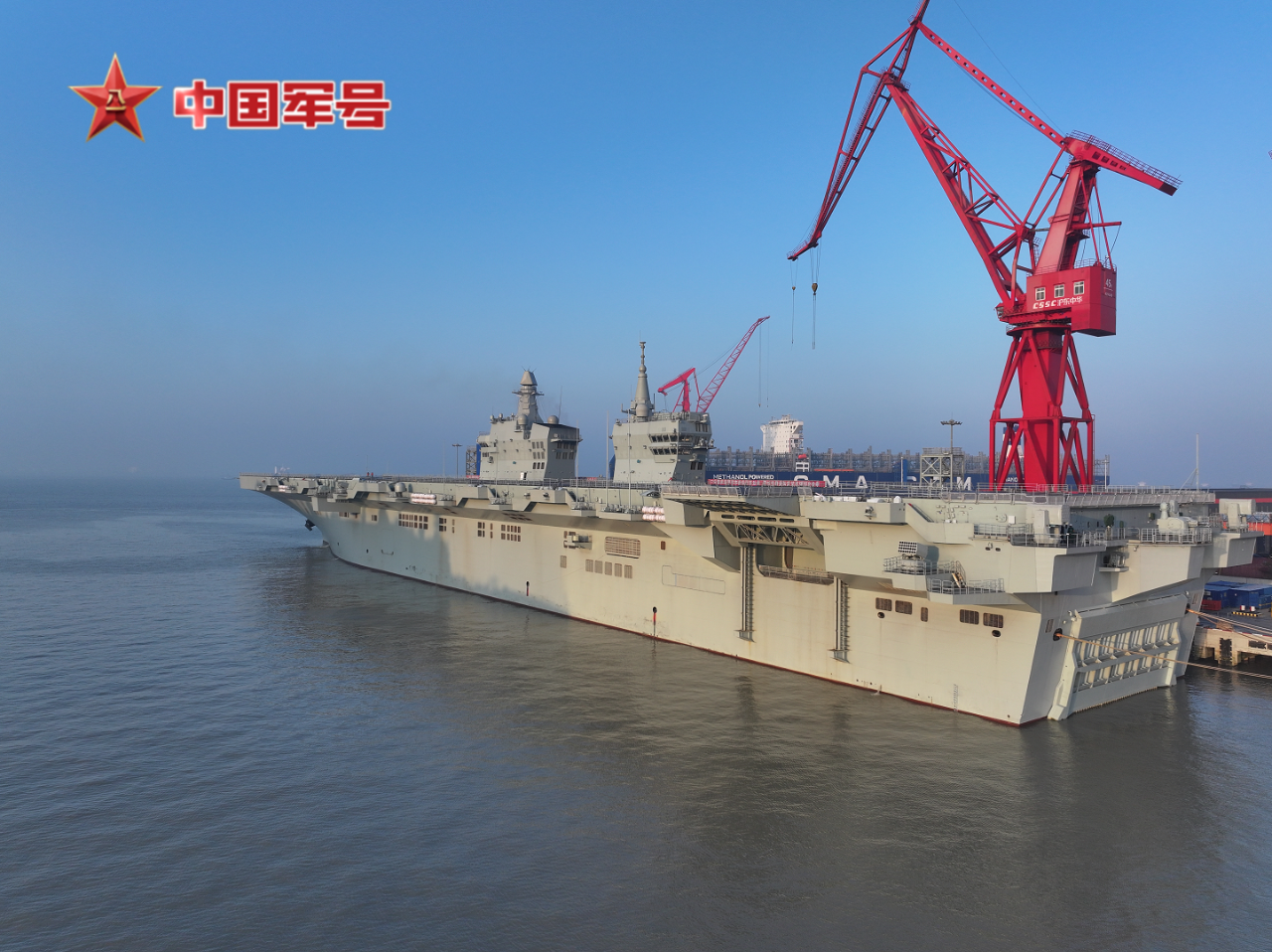 在五艘拖船的牽引下,四川艦離開滬東中華造船廠碼頭駛向相關(guān)海域。四川艦舷號(hào)為51,是海軍新一代兩棲攻擊艦,滿載排水量4萬(wàn)余噸,設(shè)置雙艦島式上層建筑和全縱通飛行甲板,創(chuàng)新應(yīng)用電磁彈射和阻攔技術(shù),可搭載固定翼飛機(jī)、直升機(jī)、兩棲裝備等。