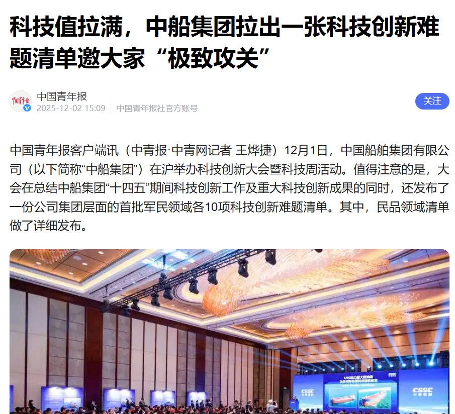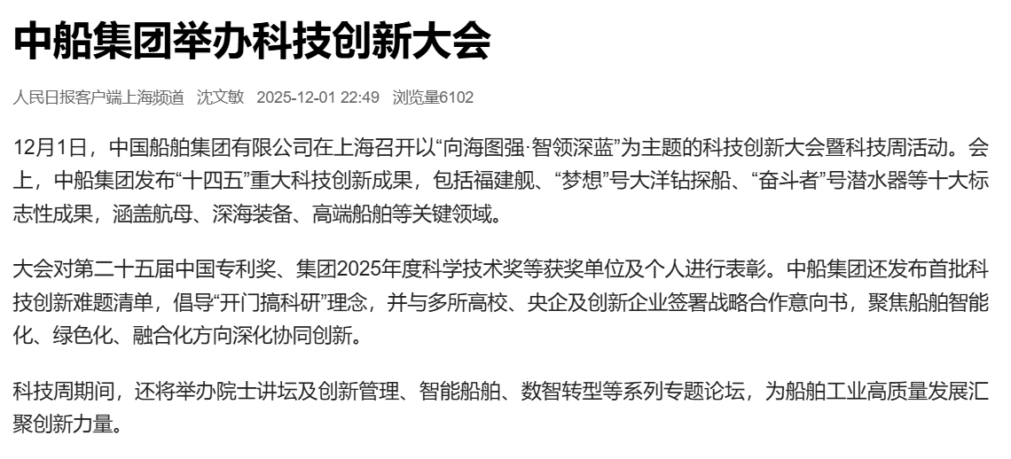12月1-5日,中國船舶集團有限公司在上海舉辦了科技創(chuàng)新大會暨科技周活動。