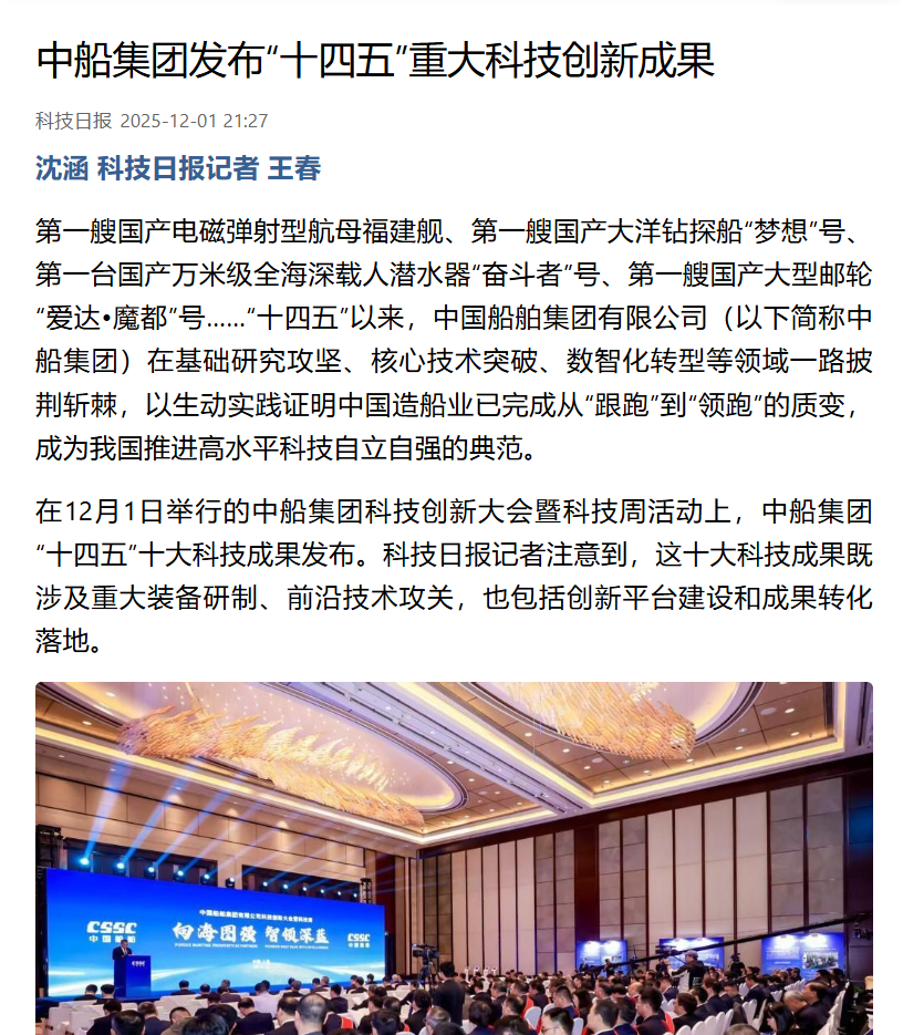 此次大會聚焦“向海圖強·智領(lǐng)深藍”主題,系統(tǒng)總結(jié)了中船集團“十四五”期間科技創(chuàng)新工作及重大科技創(chuàng)新成果,謀劃“十五五”科技發(fā)展規(guī)劃,引發(fā)中央、行業(yè)及地方媒體的廣泛關(guān)注報道。